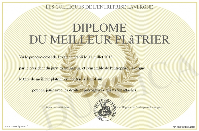 Envoyez par email votre Diplôme du meilleur plâtrier personalisé