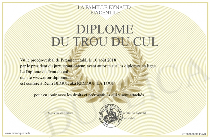 Envoyez par email votre Diplôme du Trou du cul personalisé