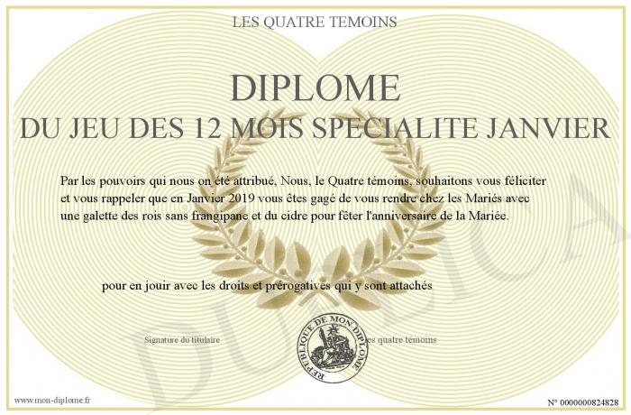 Envoyez par email votre Diplôme du Jeu des 12 mois specialité Janvier personalisé