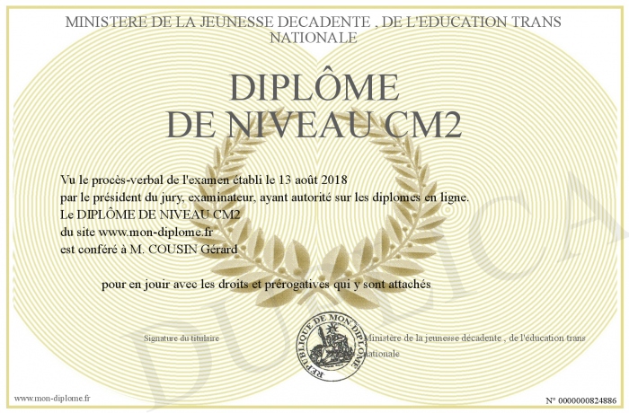 Envoyez par email votre DIPLÔME DE NIVEAU CM2 personalisé