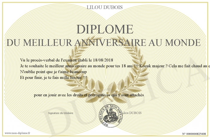 Envoyez par email votre Diplôme du meilleur anniversaire au monde personalisé