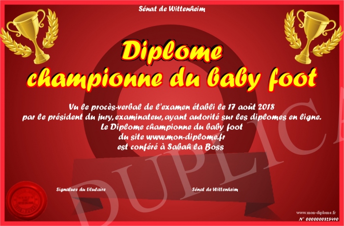 Envoyez par email votre Diplôme championne du baby foot personalisé