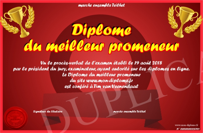 Envoyez par email votre Diplome du meilleur promeneur personalisé