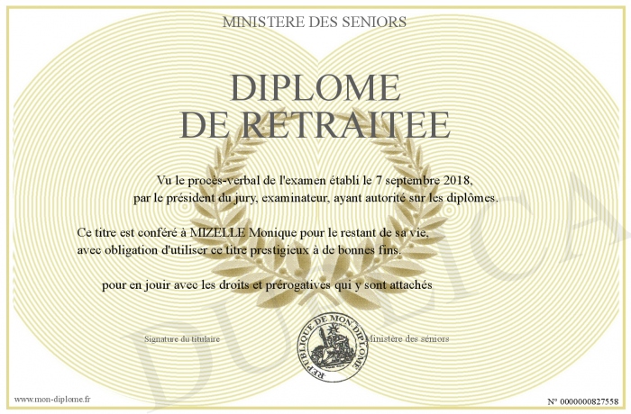 Envoyez par email votre Diplôme DE RETRAITEE personalisé