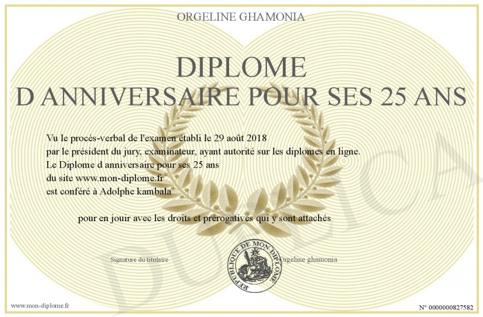 Envoyez par email votre Diplôme d anniversaire pour ses 25 ans personalisé