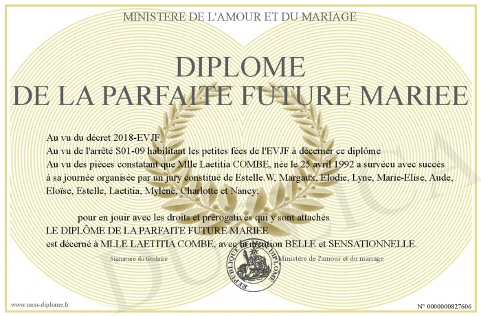 Envoyez par email votre Diplôme de la parfaite future mariée personalisé