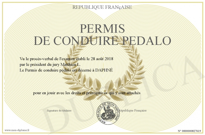 Envoyez par email votre Permis de conduire pédalo personalisé