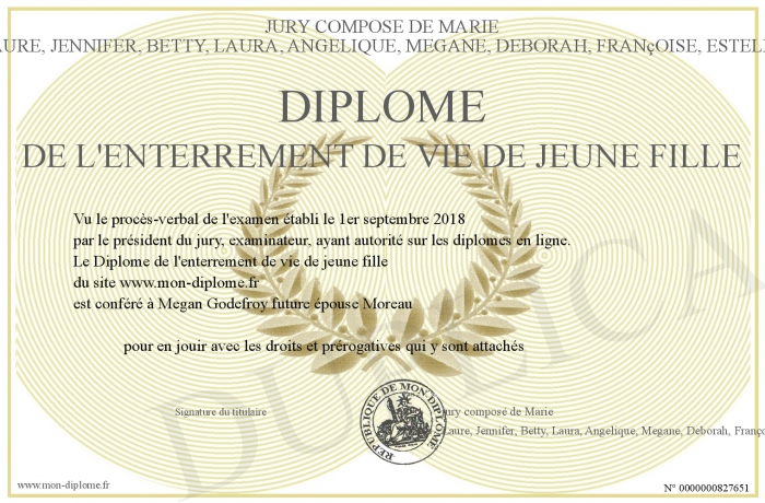 Envoyez par email votre Diplôme de l'enterrement de vie de jeune fille personalisé