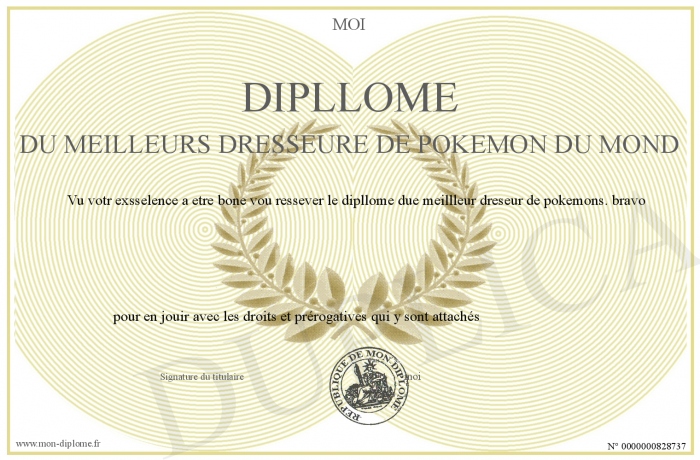 Envoyez par email votre Dipllome du meilleurs dresseure de pokemon du mond personalisé