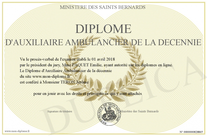 Envoyez par email votre Diplôme d'Auxiliaire Ambulancier de la décennie personalisé