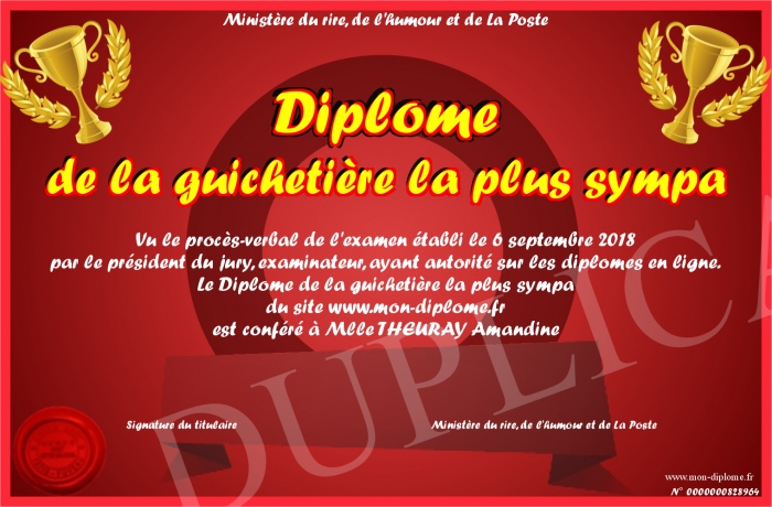 Envoyez par email votre Diplome de la guichetière la plus sympa personalisé