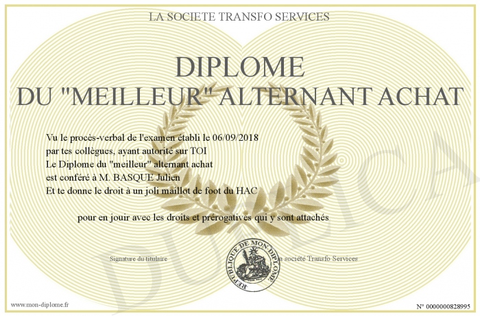 Envoyez par email votre Diplôme du -meilleur- alternant achat personalisé