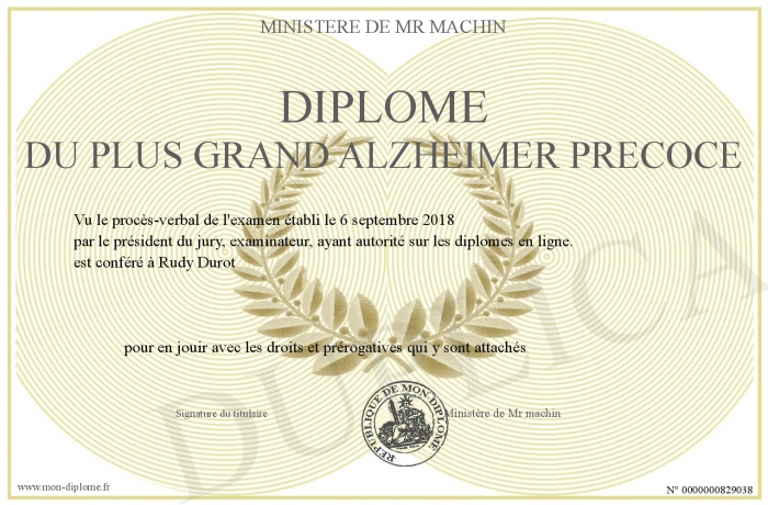 Envoyez par email votre Diplôme du plus grand alzheimer precoce personalisé