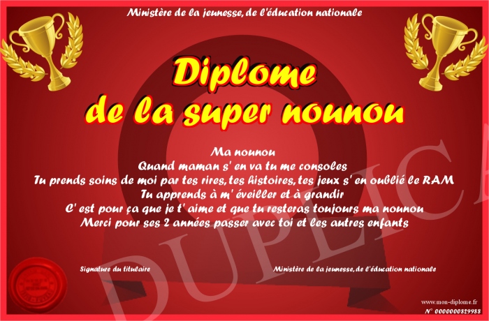 Envoyez par email votre Diplôme de la super nounou personalisé