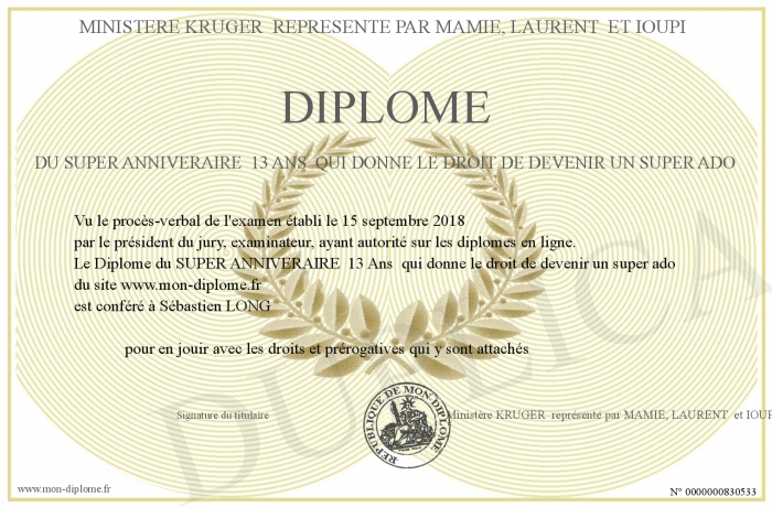 Envoyez par email votre Diplôme du SUPER ANNIVERAIRE 13 Ans qui donne le droit de devenir un super ado personalisé