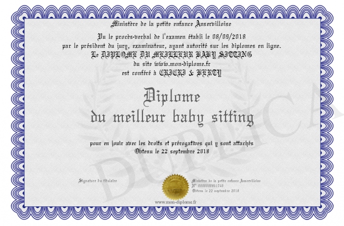 Envoyez par email votre Diplôme du meilleur baby sitting personalisé