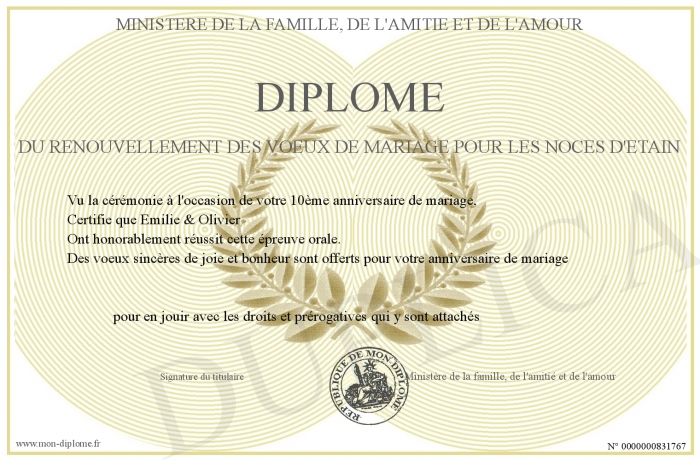 Envoyez par email votre Diplôme du renouvellement des voeux de mariage pour les Noces d'Etain personalisé