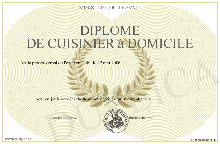 Envoyez par email votre Diplôme de cuisinier à domicile personalisé