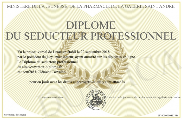 Envoyez par email votre Diplôme du séducteur professionnel personalisé