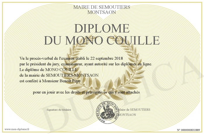 Envoyez par email votre Diplôme du mono couille personalisé