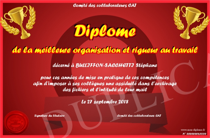 Envoyez par email votre Diplôme de la meilleure organisation et rigueur au travail personalisé