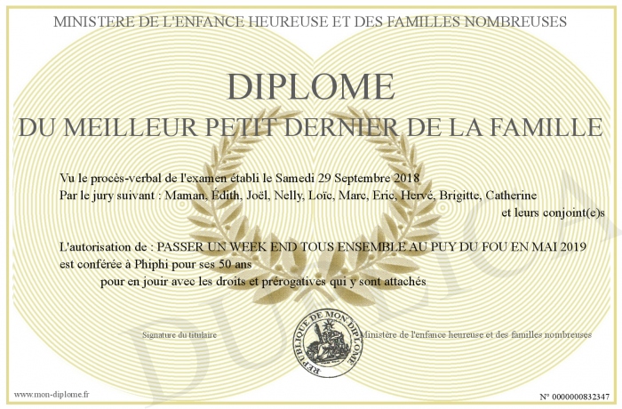 Envoyez par email votre Diplôme du meilleur petit dernier de la famille personalisé
