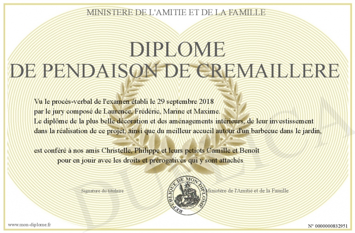 Envoyez par email votre Diplôme de pendaison de crémaillère personalisé