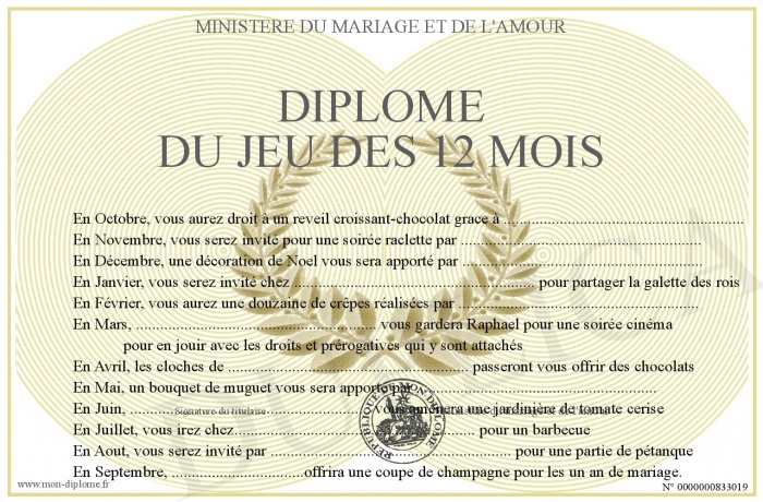 Envoyez par email votre Diplôme du jeu des 12 mois personalisé