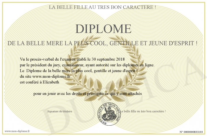 Envoyez par email votre Diplôme de la belle mère la plus cool, gentille et jeune d'esprit ! personalisé