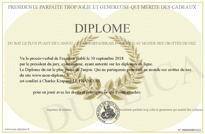 Envoyez par email votre Diplôme du rat le plus puant de l'anjou. Qui ne partagerais pour rien au monde ses crottes de nez. personalisé