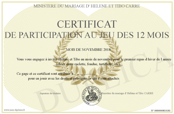 • CERTIFICAT DE PARTICIPATION AU JEU DES 12 MOIS
