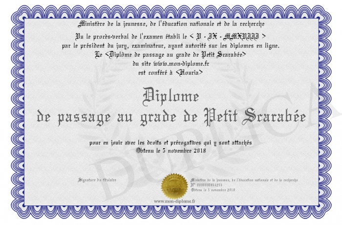 Envoyez par email votre Diplôme de passage au grade de Petit Scarabée personalisé