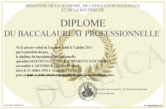 Envoyez par email votre Diplôme du baccalaureat professionnelle personalisé