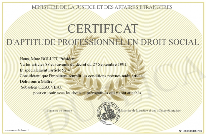 Envoyez par email votre Certificat d'aptitude professionnel en droit social personalisé