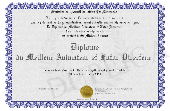 Envoyez par email votre Diplôme du Meilleur Animateur et Futur Directeur personalisé