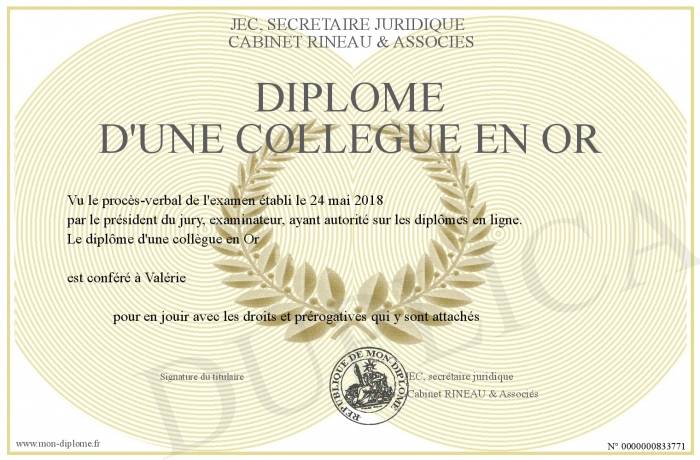 Envoyez par email votre Diplôme d'une collègue en Or personalisé