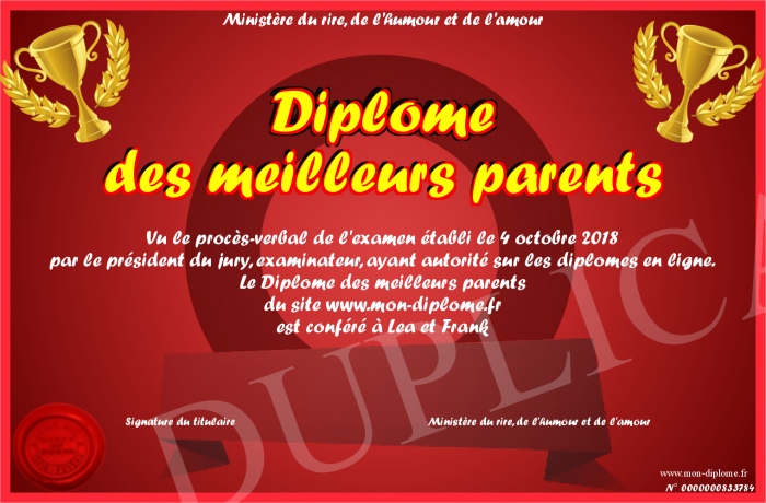 Envoyez par email votre Diplome des meilleurs parents personalisé