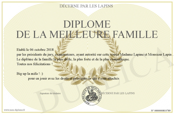 Envoyez par email votre Diplôme DE LA MEILLEURE FAMILLE personalisé