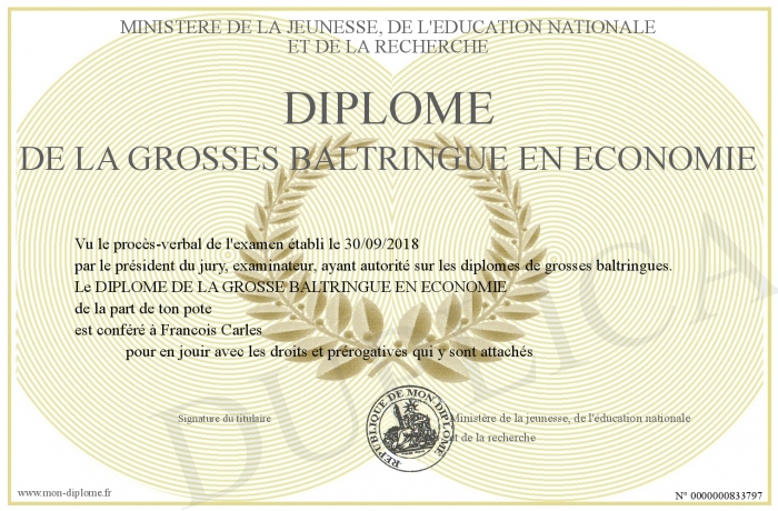 Envoyez par email votre Diplôme de la grosses baltringue en economie personalisé