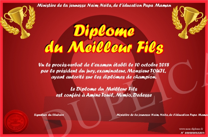 Envoyez par email votre Diplôme du Meilleur Fils personalisé