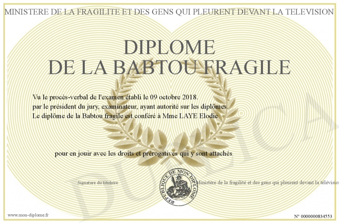 Envoyez par email votre Diplôme de la Babtou fragile personalisé