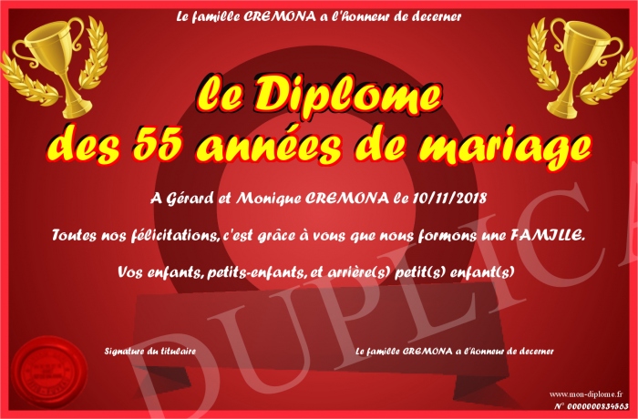 Envoyez par email votre le Diplôme des 55 années de mariage personalisé