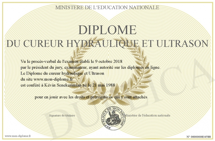 Envoyez par email votre Diplome du cureur hydraulique et Ultrason personalisé