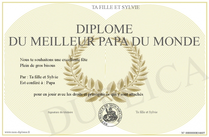 Envoyez par email votre Diplôme du meilleur papa du monde personalisé