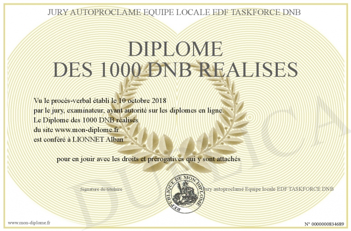Envoyez par email votre Diplôme des 1000 DNB réalisés personalisé