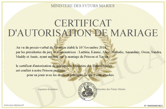 Envoyez par email votre CERTIFICAT D'AUTORISATION DE MARIAGE personalisé