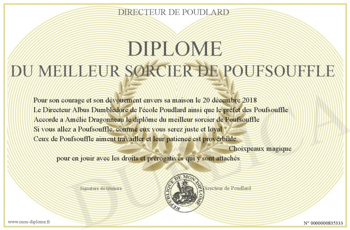 Envoyez par email votre Diplôme du meilleur sorcier de Poufsouffle personalisé