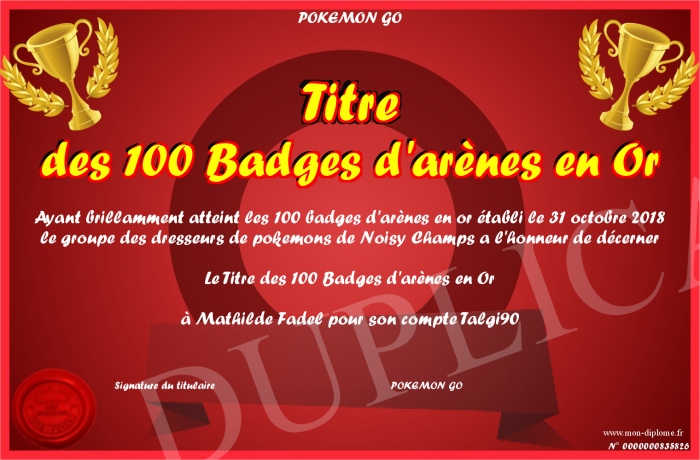 Envoyez par email votre Titre des 100 Badges d'arènes en Or personalisé