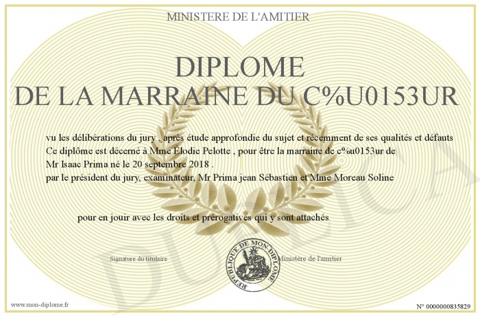 Envoyez par email votre Diplôme de la marraine du coeur personalisé