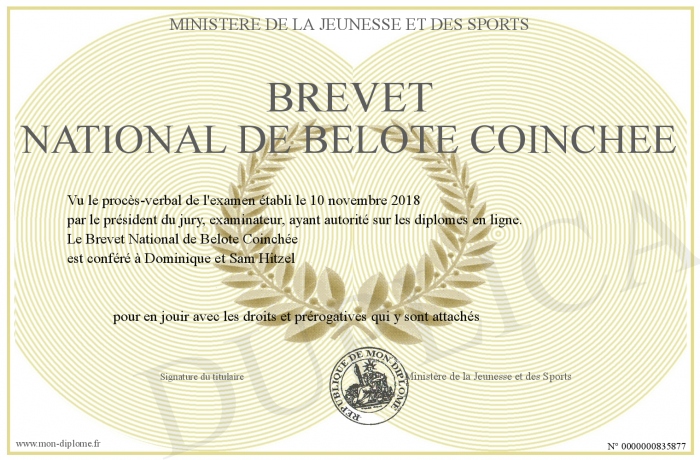 Envoyez par email votre Brevet National de Belote Coinchée personalisé